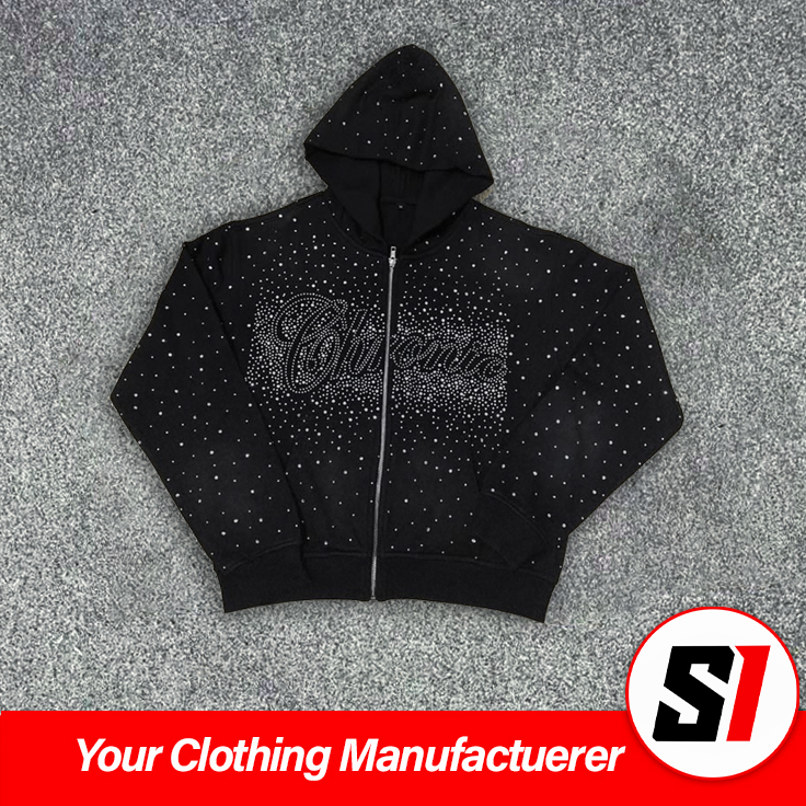 Upgrade your brand with high-end bling and heavyweight luxury. We specialize in custom Rhinestone Zipper Hoodies and premium fleece essentials, bringing elite craftsmanship from Sialkot, Pakistan to the world.